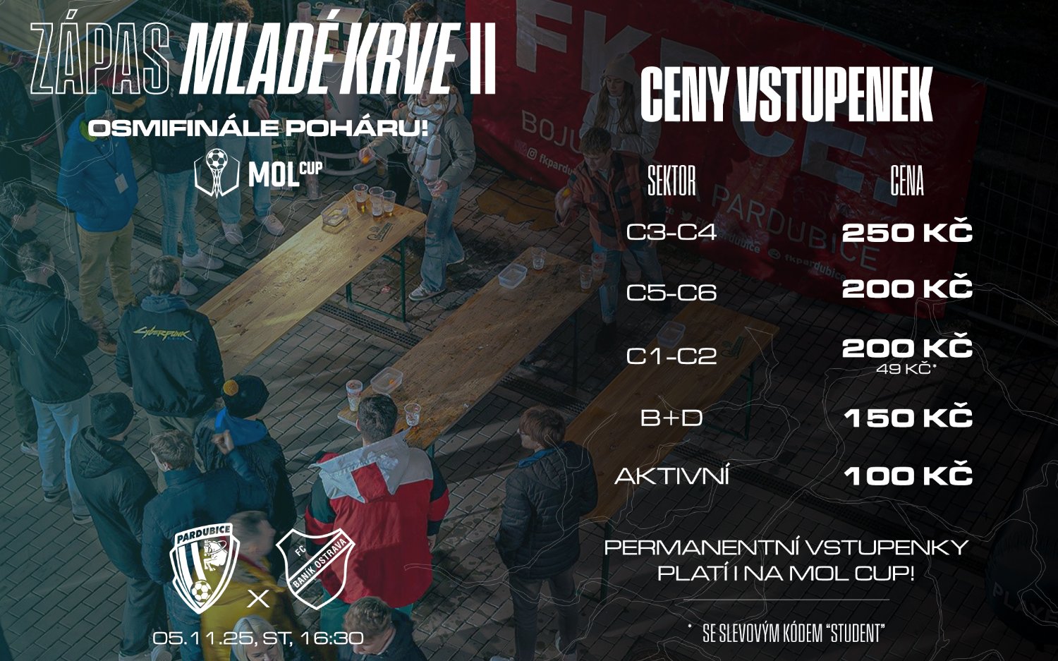 FK Pardubice si váží svých fanoušků, a tak výrazně upravil ceny vstupenek na tento osmifinálový zápas domácího poháru s Baníkem Ostrava. Vstupenky začínají již na 100 Kč, nejdražší pak stojí 250 korun. Majitelé permic pro aktuální sezónu mají pochopitelně vstup zcela zdarma!